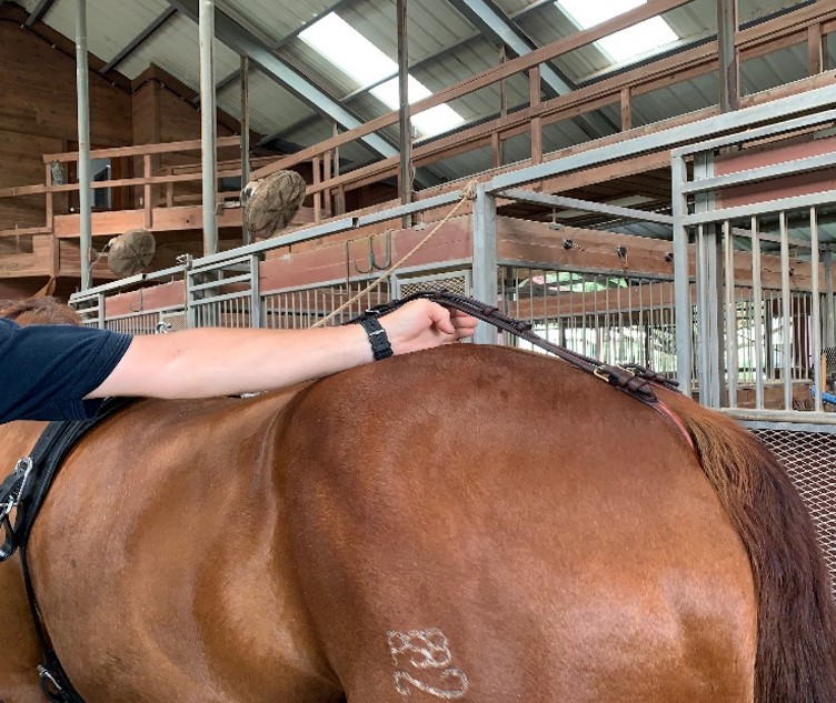 When buckling the crupper, it’s very important to pay attention. Stand to one side and ensure that as you pick up the dock (tail), you gather all of the tail hairs to prevent them laying between the crupper and dock. Hair trapped this way can cause discomfort or pain.
