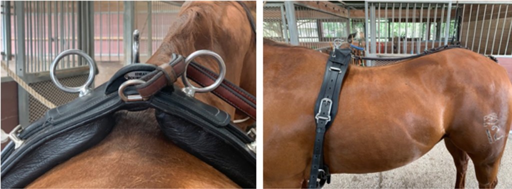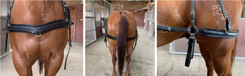 You may ask, why do we use breeching? We use it because traditionally most two wheeled carriages didn’t have brakes and the breeching allows the horse to brake/hold back a carriage when stopping or going downhill. If a horse isn’t accustomed to wearing breeching, it can be quite alarming when the harness applies pressure to the horse’s hindquarters and can cause it to buck.