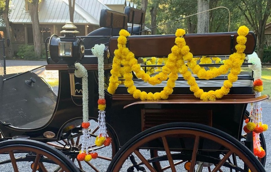 For a wedding, of course decorations are mandatory! Here, we see the carriage decorations are complete and we’re ready to hitch up the horses.