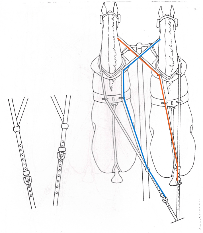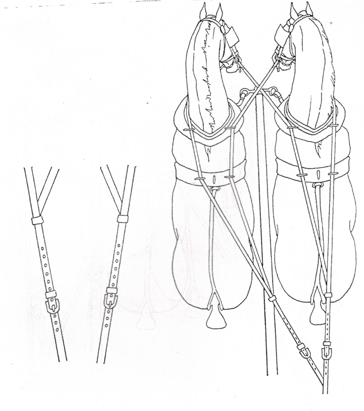 An important point in the Achenbach system is that the sum of the open holes should not change for your pair of horses. If you start with a setting of 4 + 4, and then lengthen one horse’s rein from 4 holes to 5, you must also shorten the other horse’s rein the same amount, from 4 holes to 3, so both reins will still equal 8, e.g., 5 + 3 = 8. Even if you do not have Achenbach reins, the principle applies: if you shorten one horse’s rein, you should lengthen the other horse’s rein by an equal amount to achieve balance.