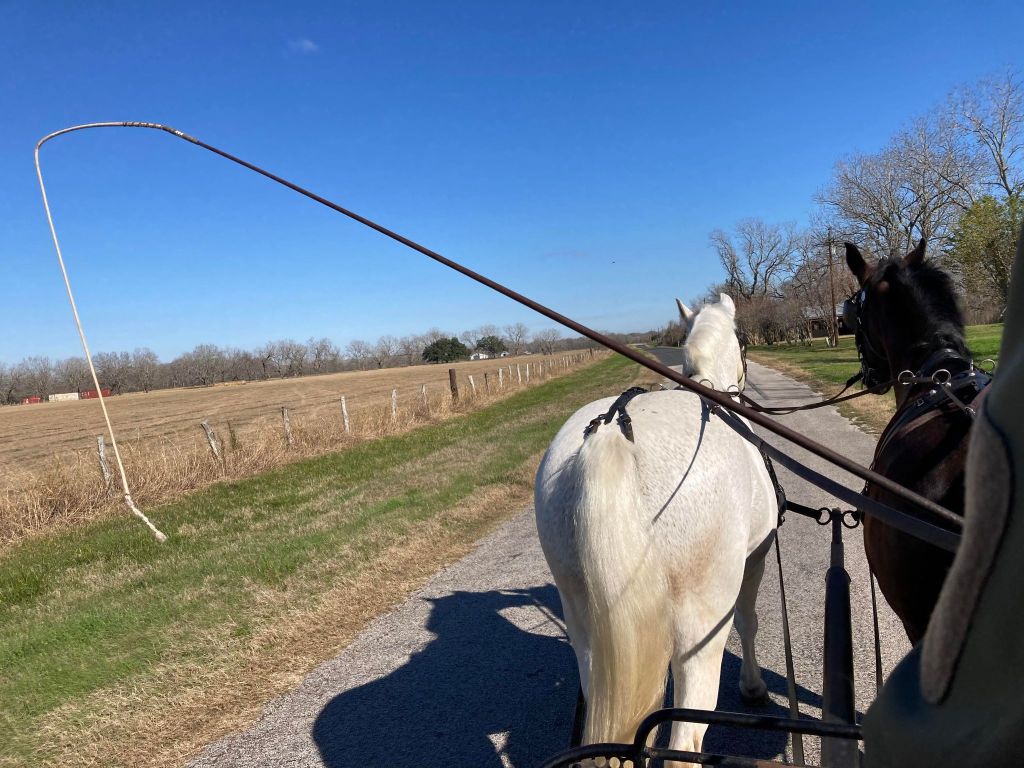 Whips are made in various lengths. Choose a whip that is the correct size; are you driving minis or drafts? Pairs or four-in-hand? The British Driving Society’s post was very helpful in suggesting the appropriate length of whip for the turnout.