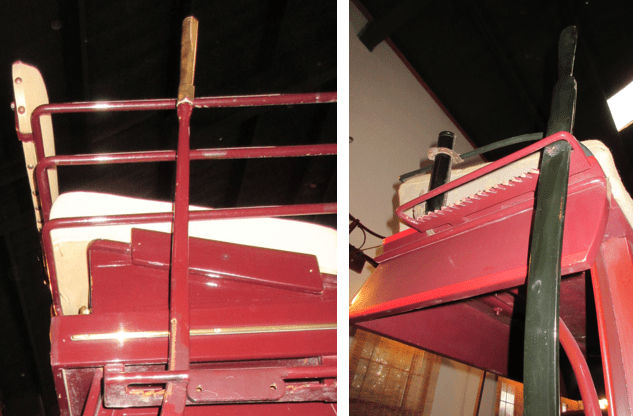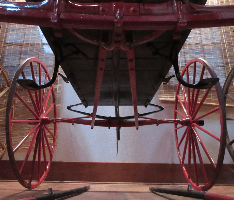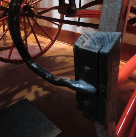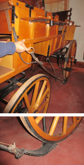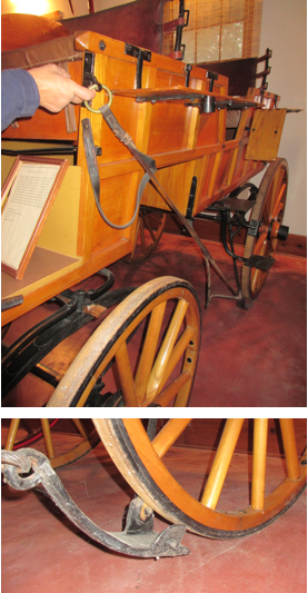 Brake wheels and levers can also be set as parking brakes. In my experience, I found the traditional wheels and levers to be a bit more intuitive to use than the mechanisms on modern carriages, which include foot pedals as well as a lever. On a modern carriage, the driver will step on the brakes and then use the lever to lock them.