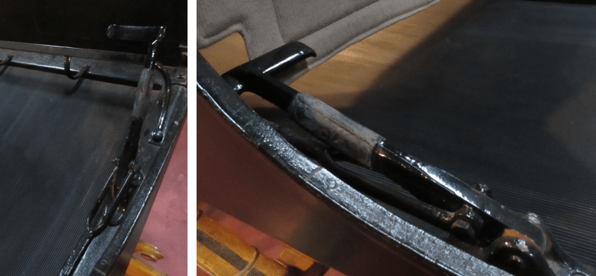 The drag shoe continued in use on some carriages well into the 19th century. It was cheap and simple, but it required a groom to apply it or remove it. The one on this Austrian hunting wagon improves on the concept through the addition of a leather strap and metal lever that enabled the box seat passenger to apply or remove the drag shoe without the help of a groom.