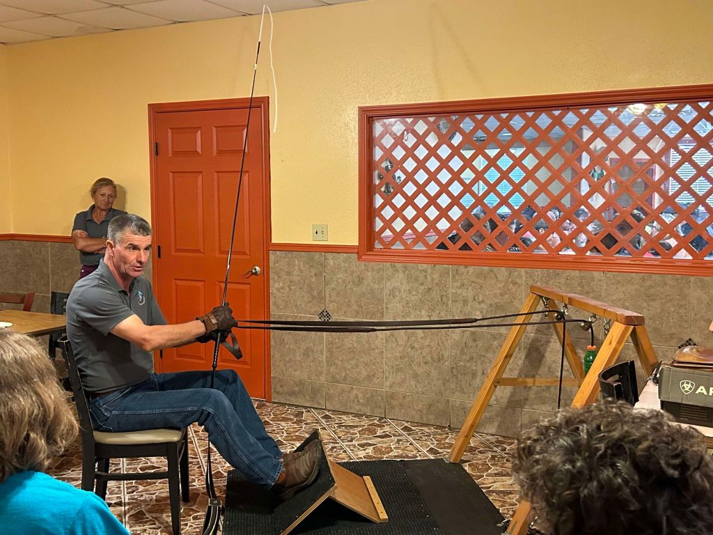 Many thanks to the Houston Area Carriage Association for the invitation to speak to the Club about Achenbach driving and our experiences with it! We enjoyed the chance to share a meal with our carriage driving friends, to talk a bit about our past driving experiences, and to demonstrate the Achenbach driving technique using our rein machine! We hope everyone enjoyed the event as much as we did!